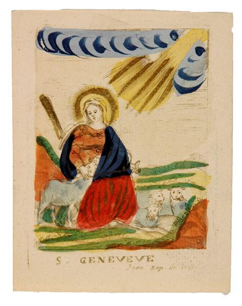 - BeschrijvingDe heilige zit op een rots in een landschap. Ze is gekleed als herderin. Haar hoed heeft ze op de rug hangen. De schapen lopen rechts van haar. Een schaap heeft de kop op haar schoot gelegd. De heilige legt haar hand op de kop van het dier. Goddelijke stralen dalen op haar neer.