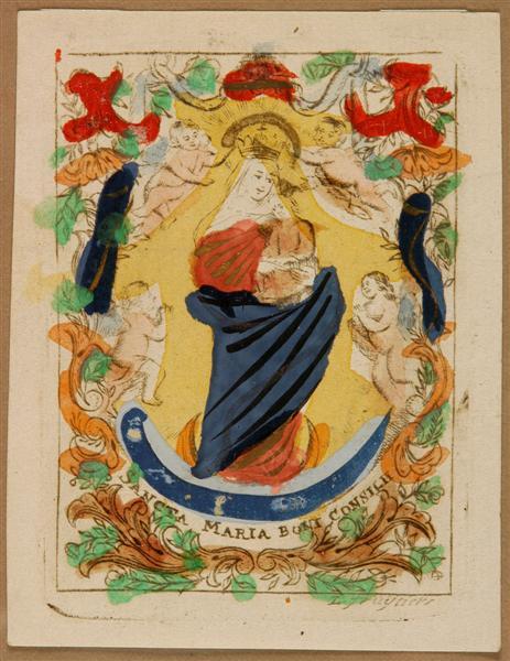 - BeschrijvingMaria met het Christuskind op haar linkerarm staat op de maansikkel. Twee engelen zetten een kroon op haar hoofd. Vier engeltjes omgeven haar, de bovenste twee dragen de kroon en de onderste houden hun handen gevouwen. Voorstelling is omgeven door weelderige florale decoratie bestaande uit acanthusbladeren en bloemen.