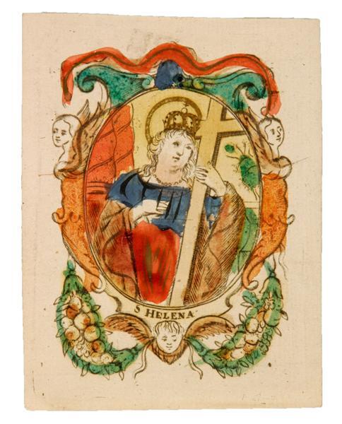 - BeschrijvingDe heilige Helena gekroond omarmt een kroon. Achter haar zijn twee gedraaide zuilen zichtbaar. Voorstelling gevat in medaillon. Medaillon omgeven door rolwerk en aan de zijde in de lengte door gevleugelde kariatide figuren. Een engelenkopje sluit af. Links en rechts twee festoenen.