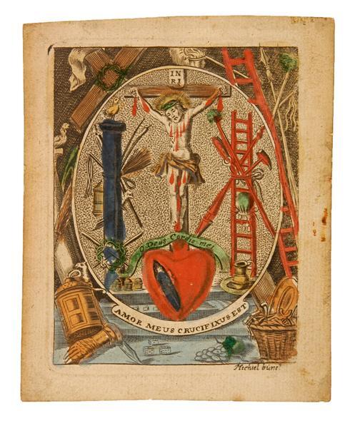 - BeschrijvingMedaillon met centraal daarin Christus aan het kruis omgeven door alle lijdensattributen. Aan de voeten van Christus een enorm hart waarop een tekstband ligt. Onder aan het medaillon een tekstblok. Het medaillon is omgeven door nogmaals alle lijdensattributen.