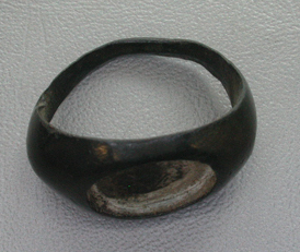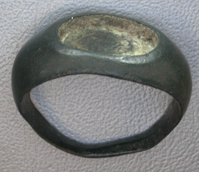 - BeschrijvingZegelring uit één stuk brons gesmeed. Binnenzijde ring is glad. De steen is er uit gevallen. Romeins