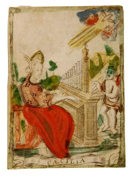 - BeschrijvingDe Heilige Cecilia gezeten in een landschap. Haar orgel wordt door een engeltje dat achter het orgeltje staat met de blaasbalg van lucht voorzien. Boven de Heilige vliegt een duif aan weerszijde bijgestaan door gevleugelde engelenkopjes. De stralen symboliseren de goddelijke inspiratie.