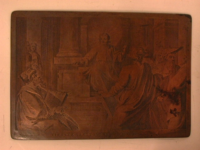 Koperplaat met gegraveerde voorstelling van Christus temidden van de leraren