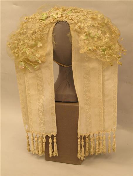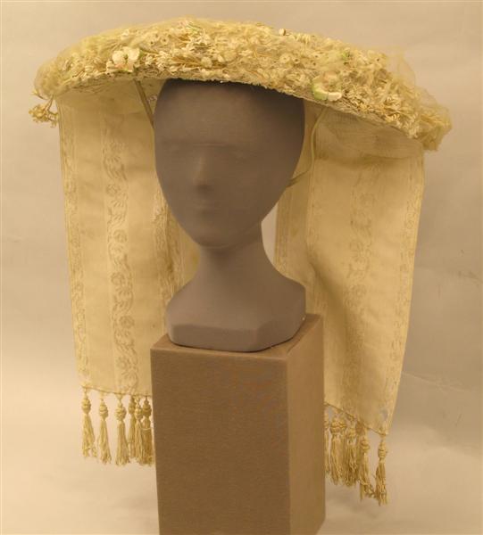 Poffer met romp en oren van sterk gesteven gaas, verstevigd met dik laiton. De romp is rijk versierd met machinale tule kant, kunstzijden en katoenen bloemen en blaadjes. Bloemen en blaadjes gedeeltelijk geverfd in de kleuren groen en rose. Tussen de romp en de versiering is een vulsel van stroken gaas aangebracht. Viskose-rayon strikken met een motief van bloemenranken en banen ribweefsel met moiré effekt. Onder aan de strikken flossen van viskoserayon. Bovenaan op de strikken 'zig-zag' gelegde stroken machinale kant. Onder op de romp is een elastiekje genaaid. Langs de voorkant van de romp en langs de achterkant tussen de strikken randjes geplooide tulen kant. Over de bloemen is een 'netje' van zijden batist aangebracht.