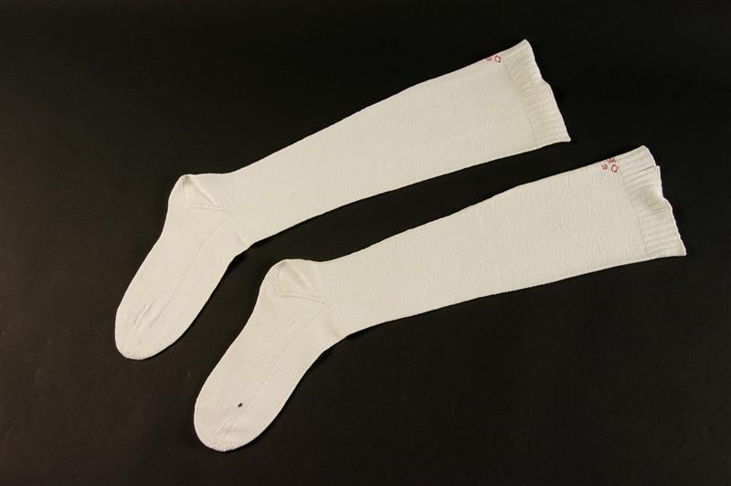 - BeschrijvingGebreide witte katoenen kousen. Grotendeels in tricotsteek, boorden in 2 recht 2 averecht. Ingebreide teen, hiel, een beennaad. Meerdering aan weerszijden van de beennaad.