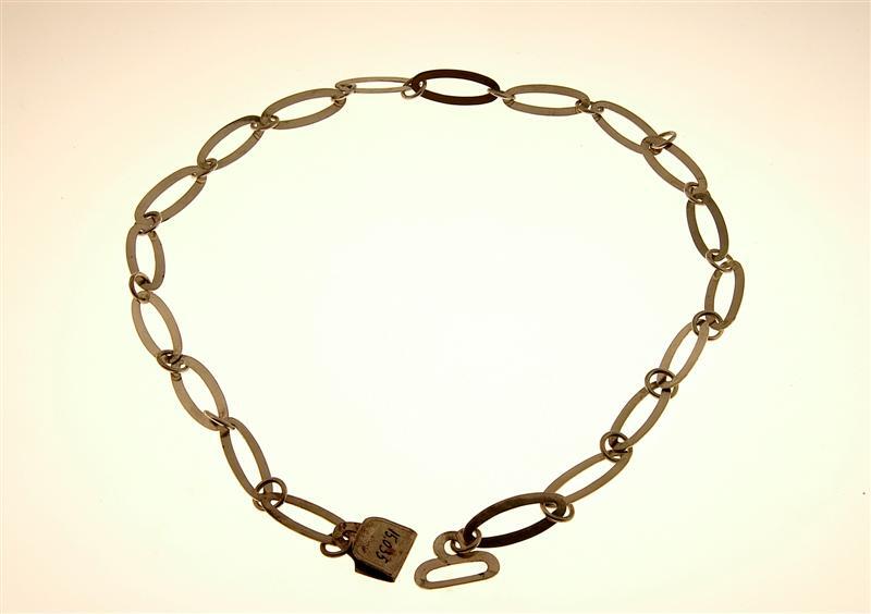 - BeschrijvingSchakelketting, bestaande uit 19 uitgerekt ovale schakels, 20 kleine ringetjes en een sluiting bestaande uit een breed, plat oog en dito haak.