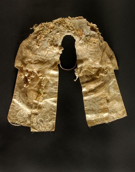 - BeschrijvingRomp en oren (vleugels) van hardgesteven gaas en laiton. Versierd met machinale katoenen kant (geometrisch motief en imitatie doorgestopte tule). Crème-kleurige zijden strikken. Bloemen van papier, zijde, katoen en glas. Elastiekje.