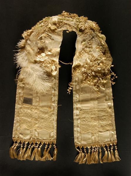 Poffer met veer. Romp en oren (vleugels) van hardgesteven gaas en laiton. Versierd met machinale katoenen kant met geometrisch motief, zijden batist met glanzende rand, zijden batist met getamboereerde randen en zijden tule met zijden machinale kant. Crème-kleurige zijden strikken met zijden franje (bandjes). Bloemen van papier en zijde. Aan linkerzijde een witte veer, waarschijnlijk later toegevoegd. Elastiek.