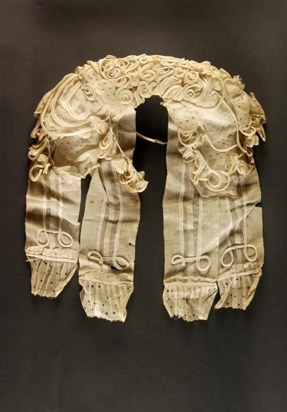 - BeschrijvingRomp en oren (vleugels) van hardgesteven gaas en laiton. Versierd met gerolde bloemen en blaadjes. Strikken versierd met gerolde bandjes. Onder aan de strikken geplooide stroken. Strikken en rolwerk van wit katoenen neteldoek. Elastiek.