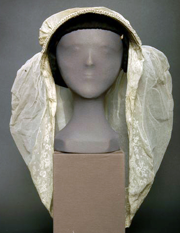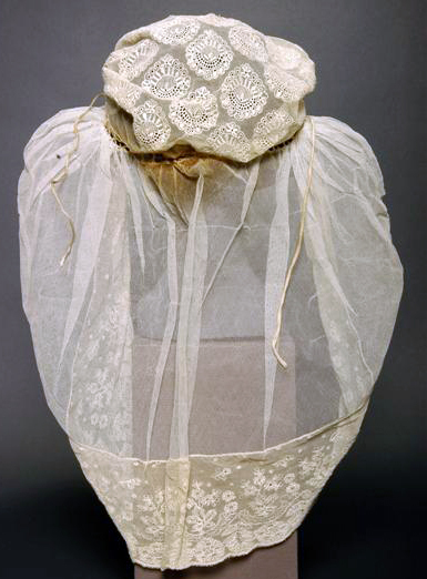 - BeschrijvingMuts met geplooid voorstrook. Voorstrook op dik laiton genaaid. Bodem met rozetten van plumetis-borduurwerk. Tulen sluier met strook doorgestopte tule. Laddertje met 2 doorgeschoven bandjes.