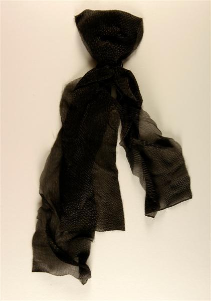 - BeschrijvingStroken zwarte zijden fantasie-crêpe, tot een halve strik gebonden. Twee aangenaaide lintjes van zwarte katoen.