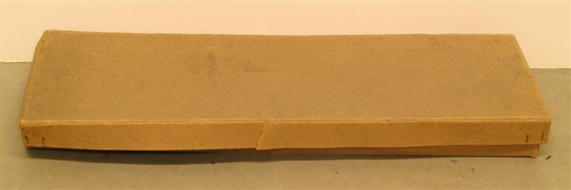 - BeschrijvingBak met deksel van bruin karton met houtnerf opdruk. In het midden van de bodem twee witte katoenen lintjes.