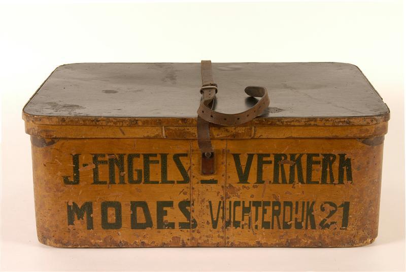- BeschrijvingSpanen koffer met aan voorzijde het adres 'J ENGELS-VERKERK / MODES Vughterdijk 21' [oorspronkelijk 'Vuchterdijk'). 's-Hertogenbosch ca 1920. Aan weerszijden het opschrift 'MODES' Op achterzijde het opschrift 'J ENGELS-VERKERK / MODES