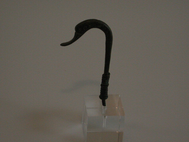 - BeschrijvingLepelsteel met vogelkop. Zeer waarschijnlijk van een pollepel met lang (± 50 cm) handvat (simpula) als Den Boesterd type 96. Een gedeelte van de hals is omwikkeld met een bronzen draad naar de mening van mejuffrouw Den Boesterd betreft het hier een antieke reparatie.