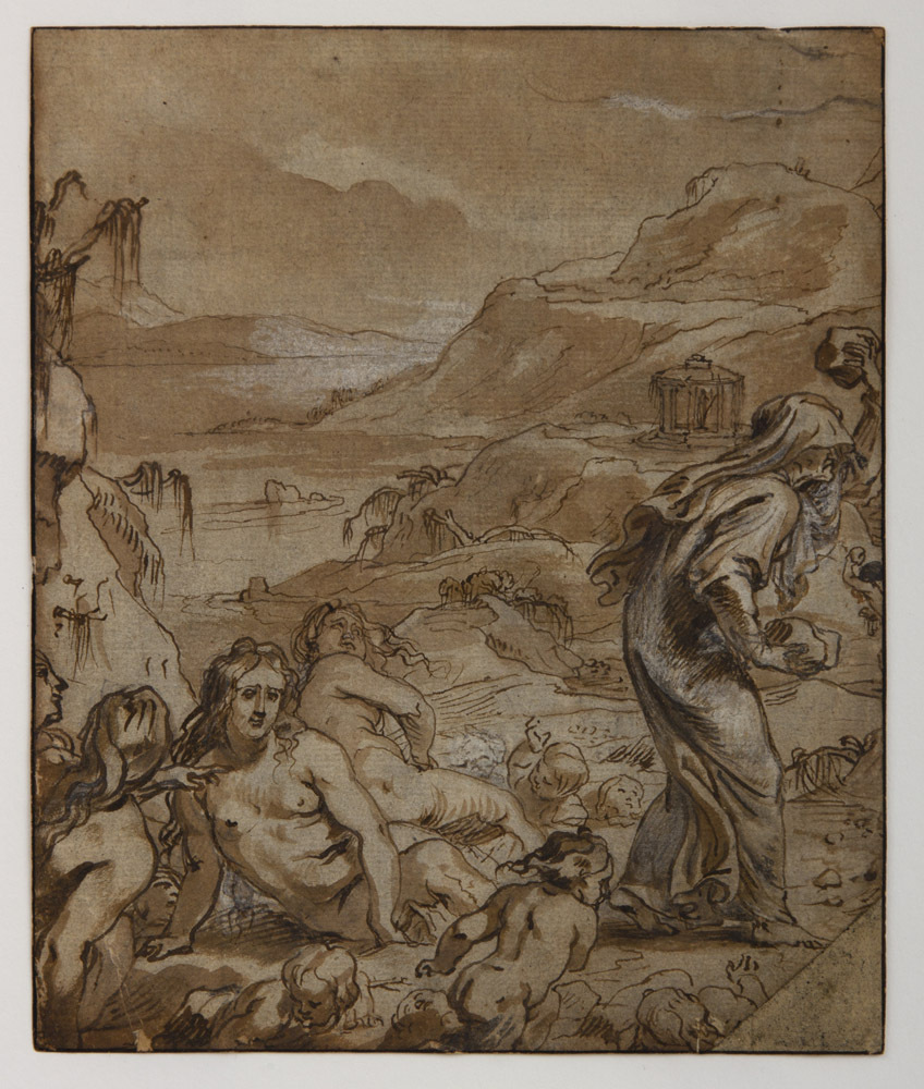 - BeschrijvingOp de voorgrond liggen vier vrouwen en zes kinderen op de grond. Zij zijn allen naakt. Rechts een vrouw, in een lang gewaad gekleed en met een lange sluier over het hoofd, die zich verwijdert. Op de achtergrond een berglandschap met een meer. Rechts op de achtergrond een tempeltje met een beeld.