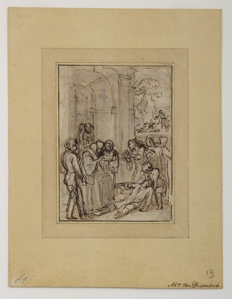 - BeschrijvingVoor een pater wordt een zieke neergelegd, naast de zieke een vrouw die zich smekend tot de pater wendt. De pater staat tussen twee mannen, hij strekt zijn handen naar de zieke uit.