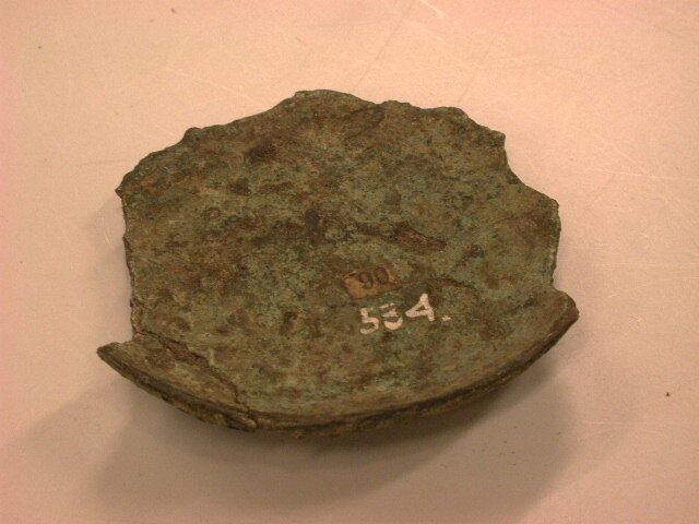 Sterk geschonden schoteltje. Romeins. Van Hoek omschrijft: Bodem, waarschijnlijk van een bronzen schoteltje of bakje