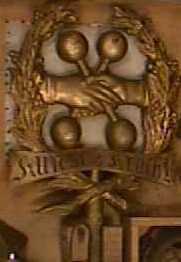 Vaandelstokbekroning voorstellende twee in elkaar grijpende handen met daartussen twee gekruiste halters