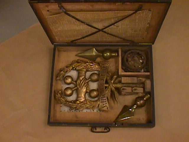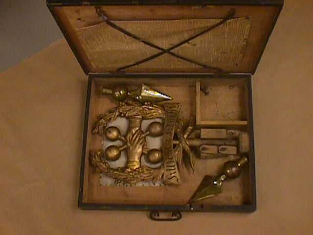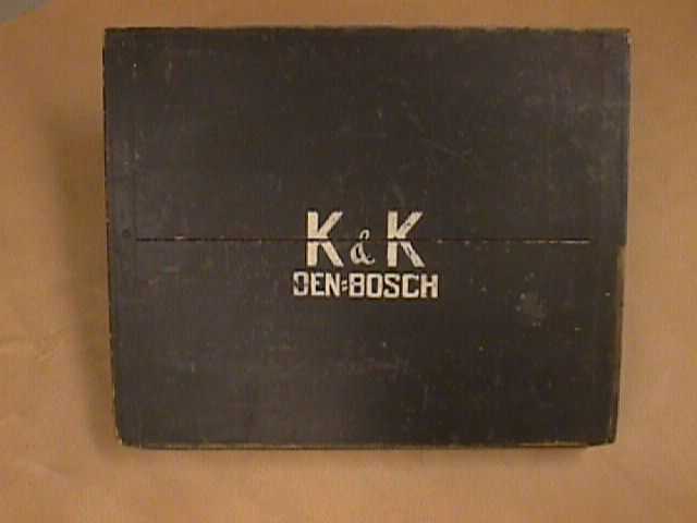 Rechthoekige houten kist met metalen greepje en slot. In de kist een verdeling in twee vakken. De kist is gemaakt voor de vaandelstokbekroning, de kroon en het vaandel van de gymnastiek en schermvereniging 'Kunst en Kracht' uit 's-Hertogenbosch.Bazuin met een winding en los inschuifbaar mondstuk dat met een kettinkje aan de buis vastzit. Op de beker een metalen plaatje met een trompettist, tussen 5 engeltjes en staande op een wereldbol. Boven hem: SOLIST en WETTING GEDEPONEERD. Onder hem: "J. Ansing & Co. Zwolle"