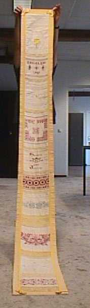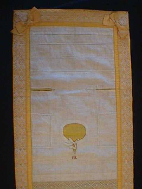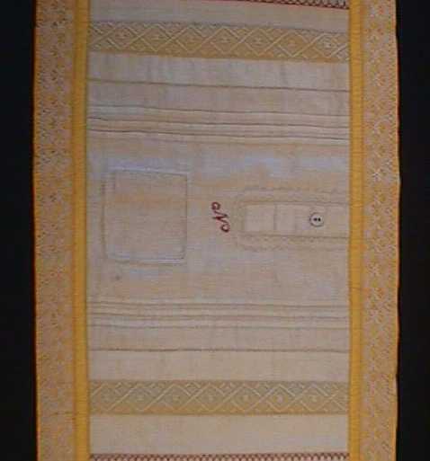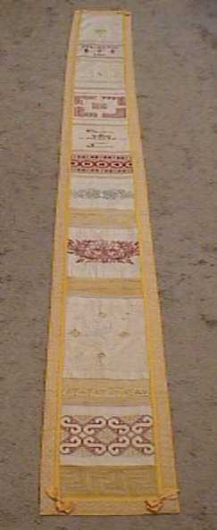 Langwerpige lap waarop 14 stukken stof te zien zijn die aan elkaar zijn gestikt. Op ieder stukje is een naai-, borduur-, stop-, of stiktechniek gemaakt. Het geheel is omrand door een kanten rand. Op de vier heoeken is een geel, zijden strikje bevestigd. De veertien stukken stof zijn aan elkaar gemaakt en op een ondergrond van gele zijde gestikt.