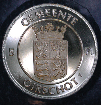 - BeschrijvingVoorzijde: een zelfportret van de pijprokende Oirschotse kunstenaar Jan Kruysen met twee kruisjes. Keerzijde: het wapen van de gemeente Oirschot.