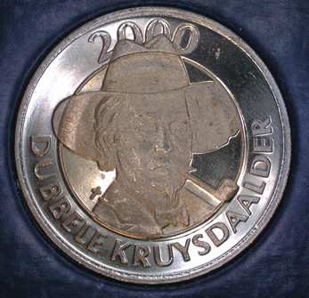 - BeschrijvingVoorzijde: een zelfportret van de pijprokende Oirschotse kunstenaar Jan Kruysen met twee kruisjes. Keerzijde: het wapen van de gemeente Oirschot.