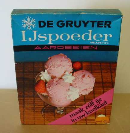 - BeschrijvingKartonnen verpakking met daarin De Gruyter ijspoeder aardbeien, 115 gram. Op de voorkant staat een ijscoupe, op de achterkant staan drie ijscoupes en de bereidingswijze. Het pak is vol.