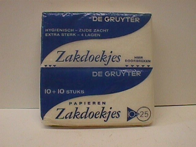 - BeschrijvingPapieren verpakking met daarin twee stapeltjes papieren zakdoekjes, in totaal twintig stuks. De verpakking is blauw met wit.