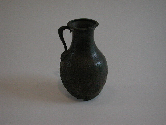 Romeinse kan met oor, met reliƫfmasker versierd.