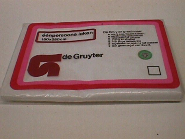 - BeschrijvingDe Gruyter wit graslinnen laken in een plastic verpakking met daarop het De Gruyter logo van na 1972. Op de voorkant lopen rode en roze banen. Het logo is rood.