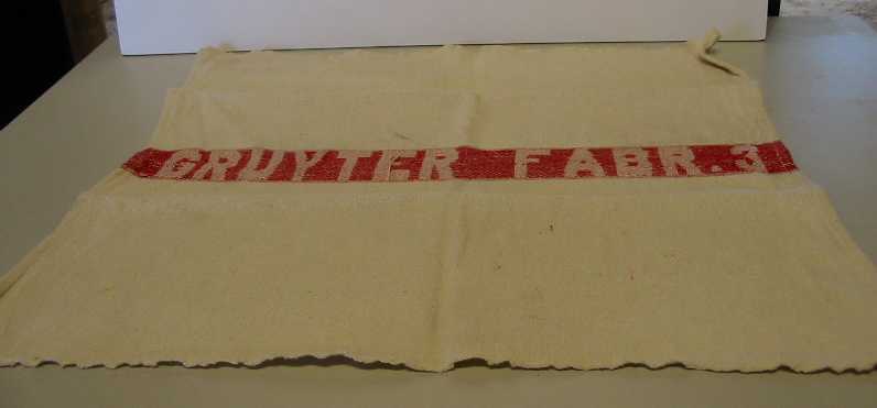 Groffe crremekleurige katoenen doek met daarop een rood met wit gekleurde baan.