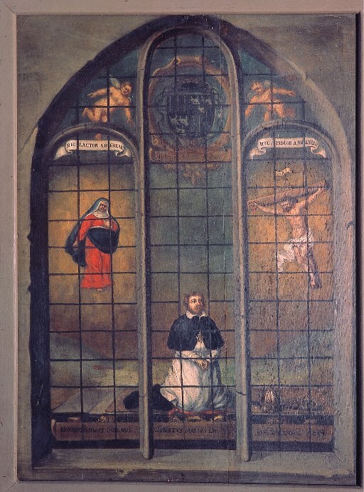 - BeschrijvingSchilderij, naar het glas-in-lood raam, met de beeltenis van Gijsbertus Masius (1546-1614) geknield tussen de beelden van Maria en Christus. Diverse opschriften.