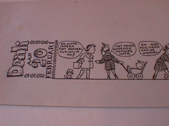 Papieren stripverhaal in zwart-wit tekeningen over inwisselen van bonnen bij De Gruyter. Oorlogsjaren.