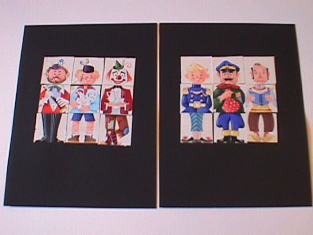 - BeschrijvingOpgeplakte kleuren schilderingen van zes verschillende figuren; ieder figuur in drie stukken geknipt en drie aan drie opgeplakt op twee vellen papier. Waarschijnlijk bedoeld voor het maken van de 'toverblokken'.