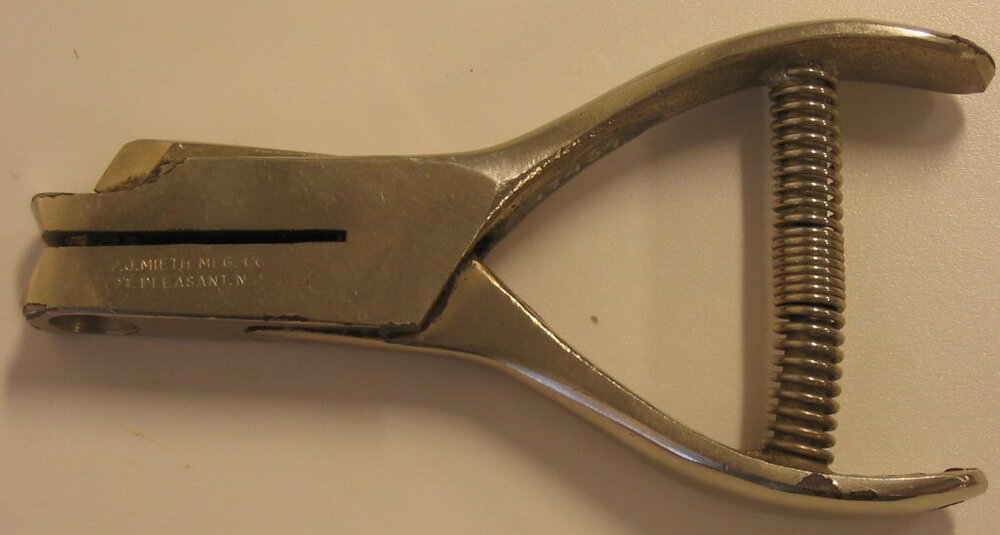 - BeschrijvingMetalen tang voor het knippen van gaatjes in kassabonnen om deze ongeldig te maken. Gebruikt in winkel van De Gruyter.
