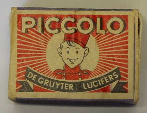 - BeschrijvingKartonnen met houten verpakking voor De Gruyter lucifers 'piccolo' met een afbeelding van een liftjongen erop met een rood uniform aan. Het doosje is leeg.