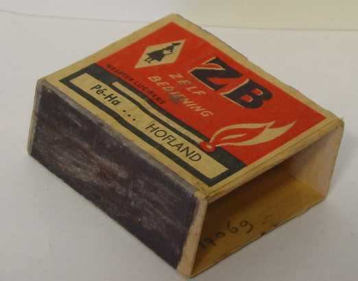 - BeschrijvingGedeelte van houten verpakking van een luciferdoosje. Het doosje heeft een rode voorkant, met daarop een aangestreken lucifer en een zwart vrouwenfiguur met een wit mandje.