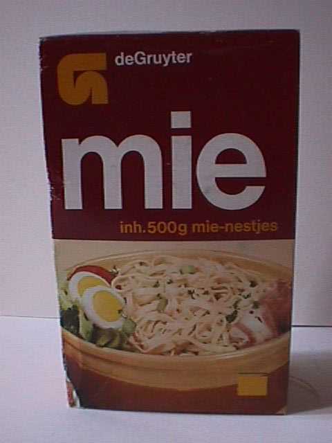 - BeschrijvingKartonnen verpakking van 500 gram mie-nestjes met op voorzijde een afbeelding van een bord gevuld met mie en gegarneerd met ei, peterselie, ham en tomaat. Op de achterzijde staat een algemeen kookvoorschrift en een recept voor Bami Goreng speciaal. Op het pak staat het De Gruyter logo van na 1972. Het pak is vol.