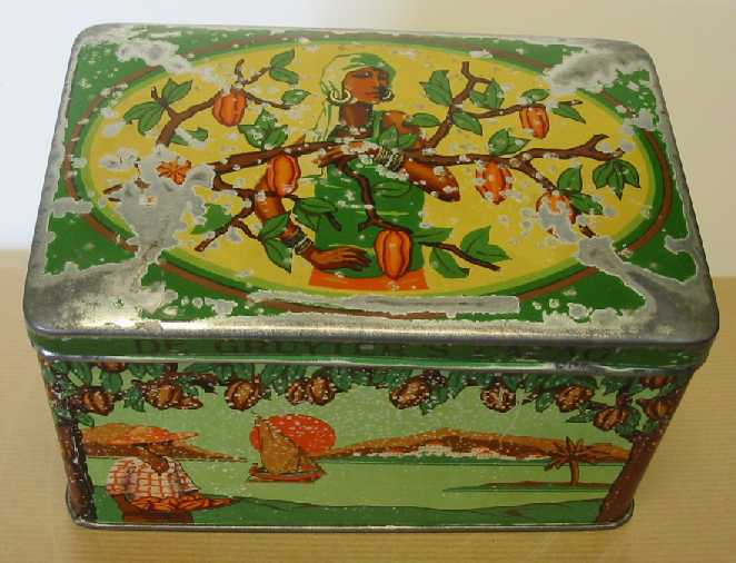 Rechthoekig klein blikje met een oogstritueel erop. Op de deksel staat een vrouw afgebeeld die haar arm om een tak van cacaoboom heeft geslagen. Op de voorkant staat een man afgebeeld die een schaal met cacaobonen vasthoudt, op de achtergrond zie je de ondergaande zon boven een dorpje aan een bergvoet. Het dorpje ligt aan water waarop een schip vaart. Dit tafereel loopt door over de hele zijkant van het blik. Rechts zie je een man cacaobonen open snijden en een grrot schip op de achtergrond. Achter staat een man met een stok afgebeeld met op de achter grond weer een dorpje aan een berg, en een meer met een scheepje erop.Links zie je een man die uitkijkt over het water waar 2 mannen in een kano opvaren, op de achtergrond een dorpje aan de voet van de berg. De algemene kleur is groen.