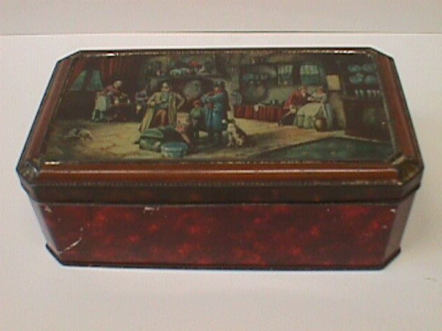 - BeschrijvingMetalen De Gruyter voorraadblik met scharnierend deksel, licht afgeschuinde hoeken en een herbergscene afgebeeld op het deksel.