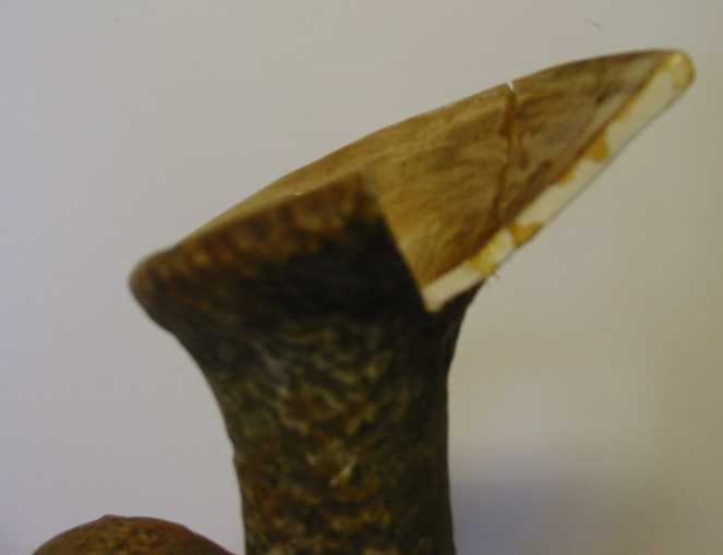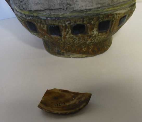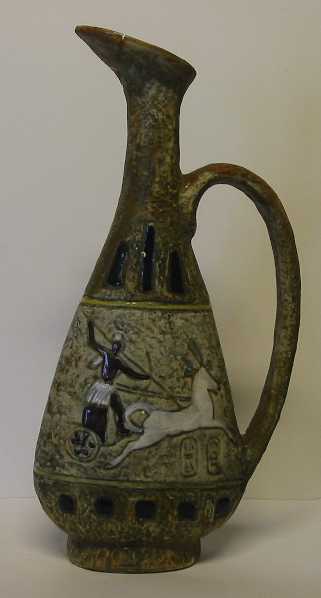 Ovale aardewerk kruik op smalle voet met dikke buik, tapstoelopend tot aan de hals met schenktuit en met een vleugelvormig handvat aan de rechter zijkant. De kruik heeft op de voorzijde een afbeelding van een wagenmenner. De wagenmenner draag een wit hoofddeksel en een witte rok. Voor de wagen is een wit paard met blauw versiersel op zijn hoofd, gespannen. De schenktuit is gedeeltelijk afgebroken. De scherf is aanwezig.