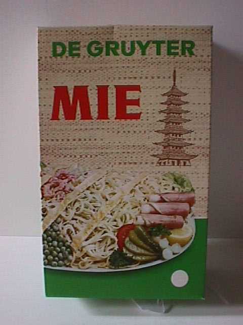 - BeschrijvingKartonnen verpakking van 500 gram mie met op voorzijde een afbeelding van een bord gevuld met mie, garnalen, doperwten, augurken, tomaat, zilveruitjes, citroen, peterselie, sla, ham en omeletreepjes en een chinese toren. Op achterzijde een algemeen kookvoorschrift en een recept voor Bami Goreng speciaal. Het pak is leeg.