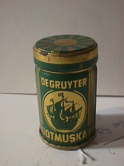- BeschrijvingMetalen groen-gouden strooibus met draaiafsluiting nootmuskaat, 25 gram. Op de voorkant staat een zeilschip en op de achterkant staat een mannetje met bloemen in zijn hand. De bus is leeg.