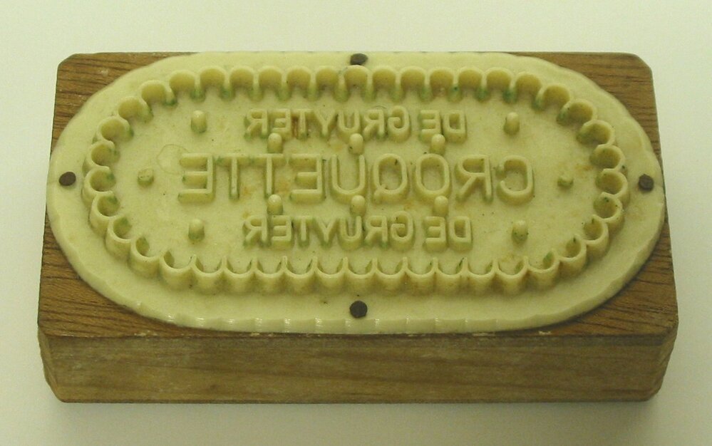 - BeschrijvingOvale kunststof stempel op rechthoekig houten blok. Gebruikt voor het stansen van croquette koekjes uit deeg.