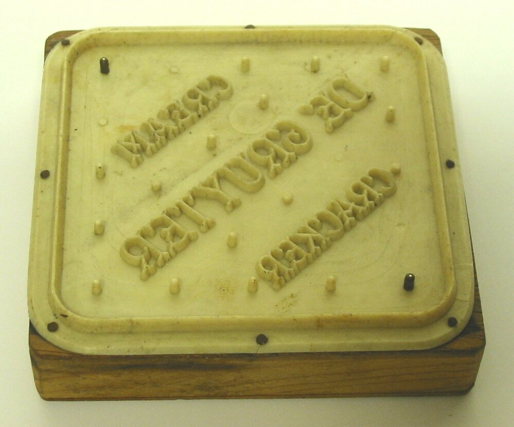 - BeschrijvingRechthoekige kunststof stempel op een rechthoekige houten blok. Gebruikt voor het stansen van creamcrackers uit deeg.