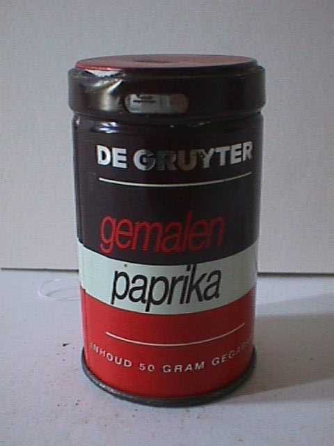 Ronde, metalen bus met draaibaar strooideksel in de kleuren bruin, rood en wit. De bus is vol.