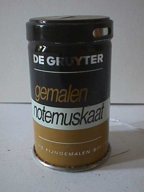 - BeschrijvingRonde, metalen bus notemuskaat met draaibaar strooideksel in de kleuren licht en donker bruin.