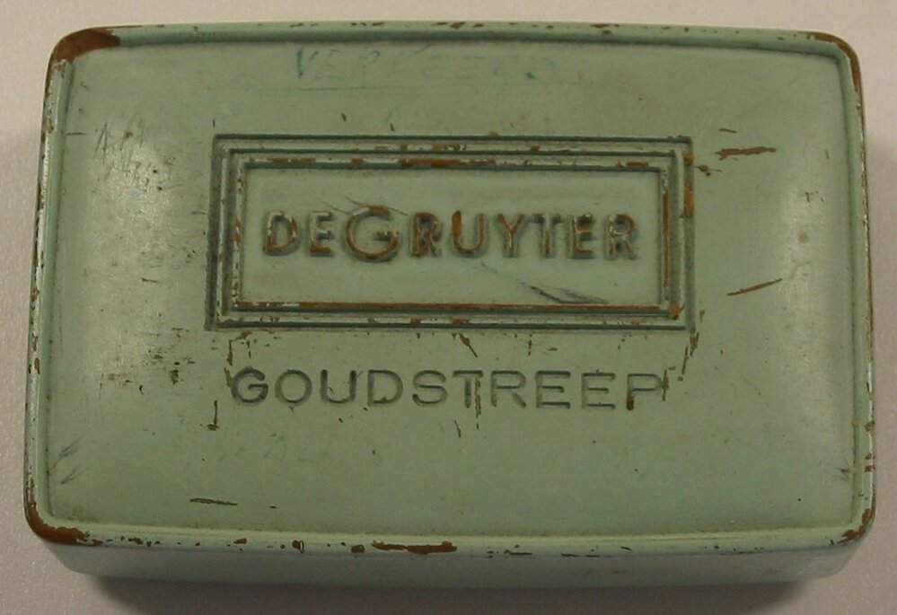 - BeschrijvingKunststof tablet De Gruyter zeep Goudstreep. De zeep is lichtgroen van kleur en er staan inscripties in. Tekst in een rechthoek.