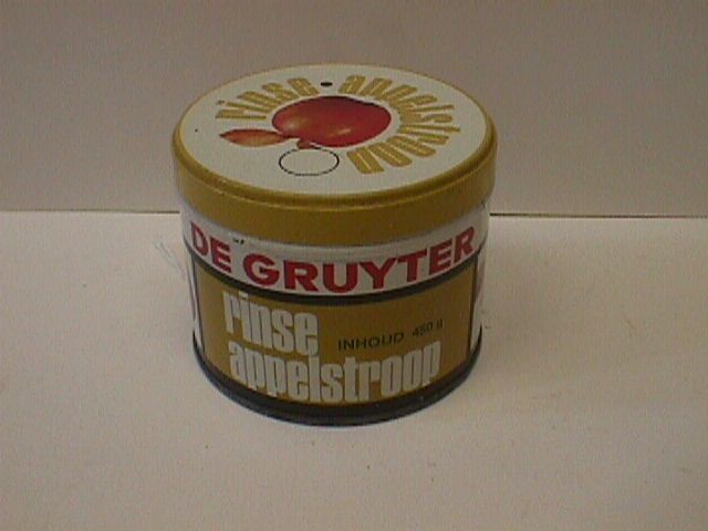 - BeschrijvingMetalen pot met deksel in de kleuren wit-geel De Gruyter rinse appelstroop, inhoud 450 gram. Aan weerszijden en op het deksel staan appels afgebeeld. Het blik is leeg.