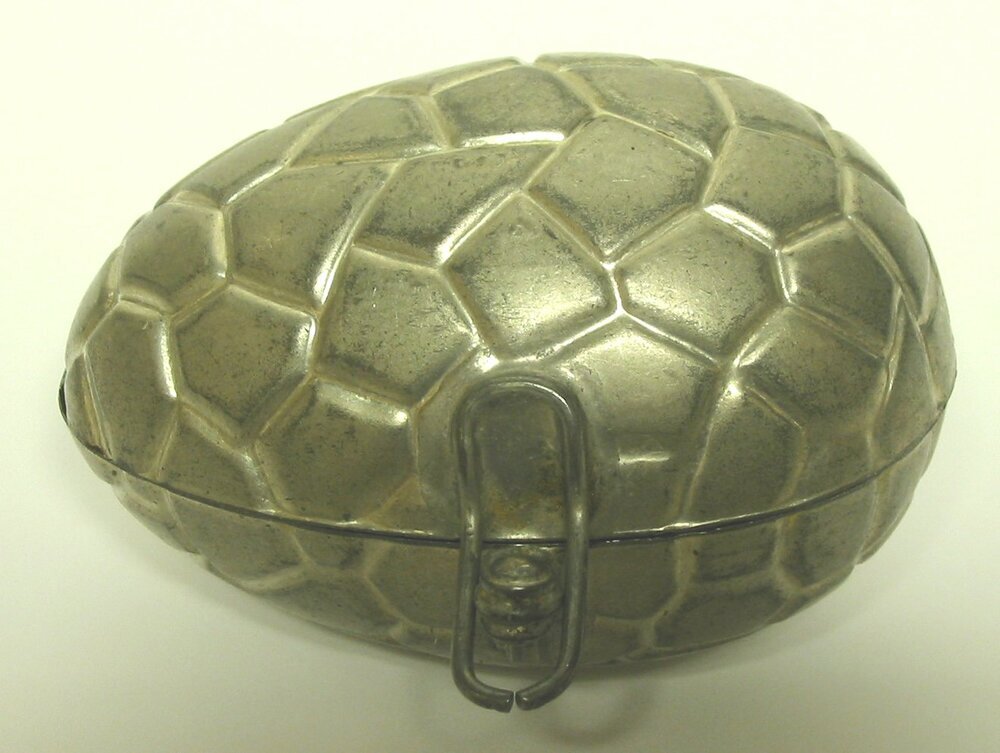 - BeschrijvingMetalen chocoladevorm, ei-vormig, bestaande uit twee scharnierende helften te sluiten met een metalen klemslotje. Het ei heeft een schildpad decor.